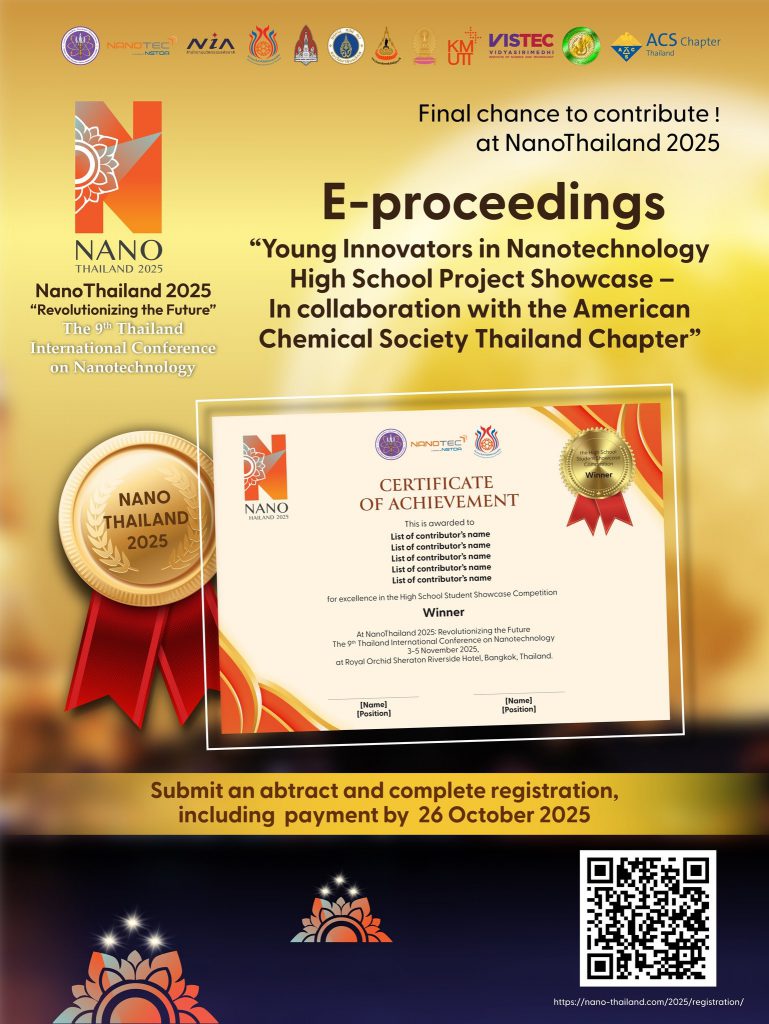 We are delighted to invite high school students to participate in the Poster Presentation Session at the upcoming NanoThailand 2025 Conference and share your research results in the form of proceedings papers in E-proceedings Special Issue “Young Innovators in Nanotechnology: High School Project Showcase – In collaboration with the American Chemical Society Thailand Chapter”